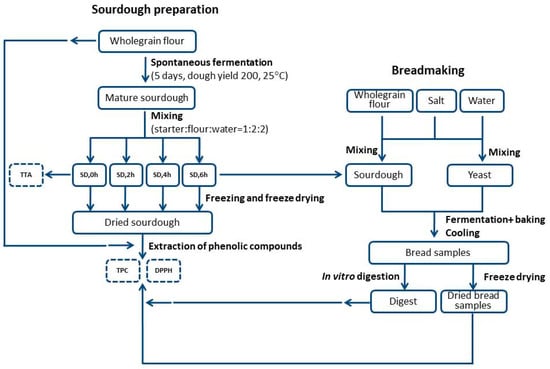 Scheme of experimental procedure used in this study. Abbreviations: SD—sourdough, TTA—total titrable acidity, TPC—total phenolic content, DPPH—antioxidant capacity according to DPPH method.