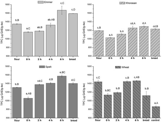 Evolution of total phenolic content during 6 h of sourdough preparation and breadmaking. Different lowercase letters indicate statistically significant differences within the group of the same wheat variety, while different uppercase letters indicate statistically significant differences between different wheat varieties in all stages individually (flour, different intervals of dough fermentation time and sourdough bread). Control refers to yeast fermented wheat flour bread, used as reference bread for comparison with the obtained sourdough breads.