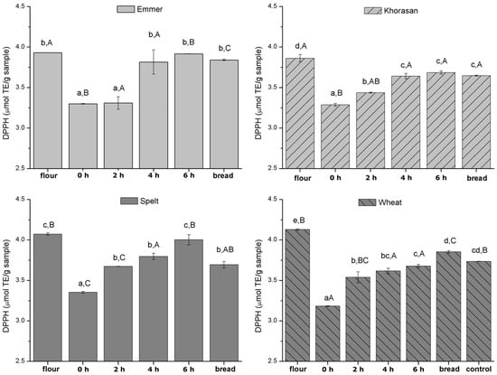 Evolution of DPPH antioxidant activity during 6 h of sourdough preparation and breadmaking. Different lowercase letters indicate statistically significant differences within the group of the same wheat variety, while different uppercase letters indicate statistically significant differences between different wheat varieties in all stages individually (flour, different intervals of dough fermentation time and sourdough bread). Control refers to yeast-fermented wheat flour bread, used as reference bread for comparison with the obtained sourdough breads.