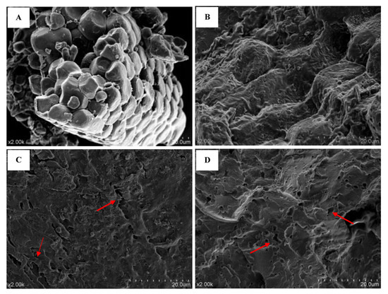 Scanning electron microscopy of whole Tartary buckwheat flour (A), fresh Tartary buckwheat noodles (B), dried Tartary buckwheat noodles (C), and frozen Tartary buckwheat noodles (D).