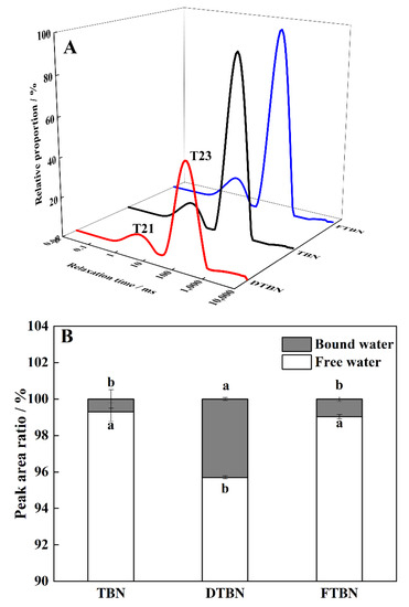 Water distribution of Tartary buckwheat noodles boiled at the optimum cooking time. Curves of T2 relaxation time (A); the peak area ratio of T2 (B). TBN, fresh Tartary buckwheat noodles; DTBN, dried Tartary buckwheat noodles; FTBN, frozen Tartary buckwheat noodles. Different letters in the same figure imply that the values are significantly different (p < 0.05).