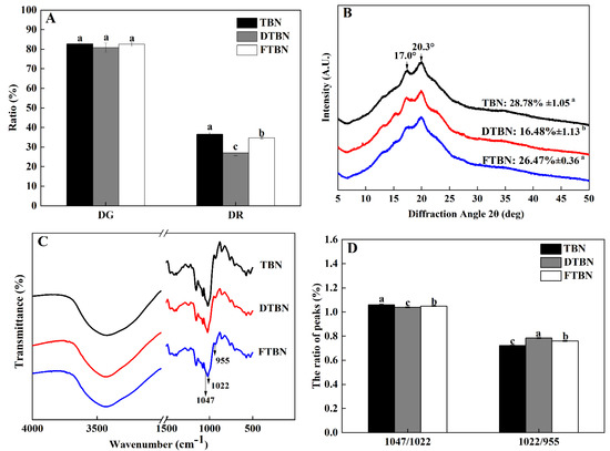 Changes in starch properties and the structure of Tartary buckwheat noodles. Starch gelatinization and retrogradation (A); X-ray diffraction (B); Fourier transform infrared (C); the absorbance ratios at 1047/1022 and 1022/955 cm−1 (D). DG, degree of starch gelatinization; DR, degree of starch retrogradation; TBN, fresh Tartary buckwheat noodles; DTBN, dried Tartary buckwheat noodles; FTBN, frozen Tartary buckwheat noodles. Different letters in the same figure imply that the values are significantly different (p < 0.05).