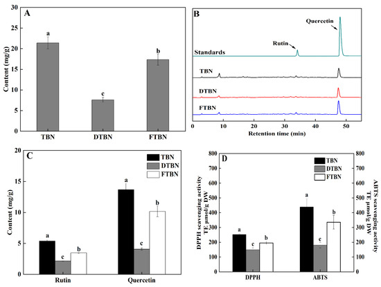 Functional property of Tartary buckwheat noodles. Total flavonoid content (A); High-Performance Liquid Chromatography (HPLC) of quercetin and rutin (B); quercetin and rutin contents (C); DPPH and ABTS scavenging activities (D). TBN, fresh Tartary buckwheat noodles; DTBN, dried Tartary buckwheat noodles; FTBN, frozen Tartary buckwheat noodles. Different letters in the same figure imply that the values are significantly different (p < 0.05).