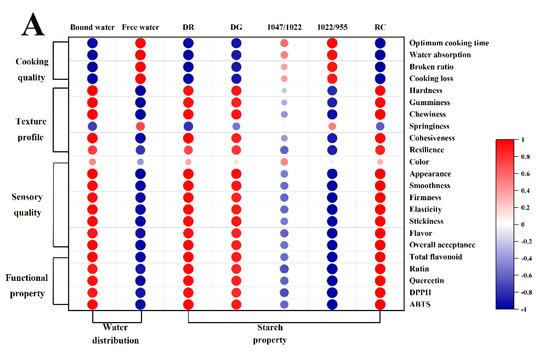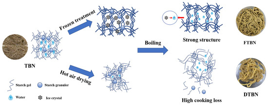 Pearson correlations between noodle quality and water or starch properties are shown in Figure 5A, and PCA was used to visualize the impact of the different treatments on the sensory and functional qualities of noodles (Figure 5B). PC1 (13.2%) and PC2 (70.6%) accounted for 83.6% of the total variance, indicating the reliable main contribution of variables. Free water showed a positive correlation with cooking loss and broken ratio, but bound water was the opposite, which supported the findings that bound water was beneficial for the cooking quality of extruded noodles. Similar to texture profiles and sensory quality, the positive correlation of bound water suggested its key role in the quality improvement of TBN. The interaction between water molecules and starch granules was strengthened, and the increase in the bound water ratio might promote the ordered arrangement of starch and the structural stability of noodles. The important roles of starch retrogradation were also confirmed by the close correlations of DR, RC, and the peak ratio of 1022/955 with cooking, textural and sensory qualities (Figure 5A). The changes in the sensory and functional qualities of TBN and FTBN showed the same positive correlation as PC1, but not DTBN (Figure 5B). According to the above findings, the schematic diagram of the different influences on noodles quality between frozen treatment and hot air drying was created (Figure 6). The maintained ice crystals in the noodles induced by freezing promoted the starch gelatinization evenly during boiling, as well as uniform retrogradation during cooling afterward. The bound water enhanced the stability of the starch gel structure. The water distribution is critical for the starch molecular rearrangement, which resulted in the frozen treatment that protected the noodles from serious cook loss, and they did not like hot air drying. The stable quality of FTBN allowed the better preservation of flavonoid content and antioxidant capacity of noodles, maximizing the health benefits of Tartary buckwheat.