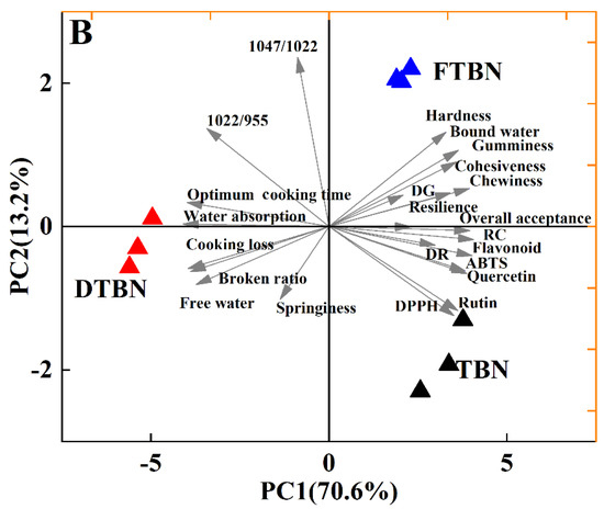 Association of quality of Tartary buckwheat noodles with the changes in the water distribution and starch properties. Pearson correlation coefficients (A) and Principal Component Analysis (PCA) (B). DG, degree of starch gelatinization; DR, degree of starch retrogradation; RC, relative crystallinity; TBN, fresh Tartary buckwheat noodles; DTBN, dried Tartary buckwheat noodles; FTBN, frozen Tartary buckwheat noodles.