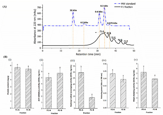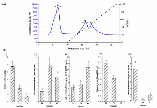 3.2. Purification of ACE-Inhibitory and Antioxidant Peptides
