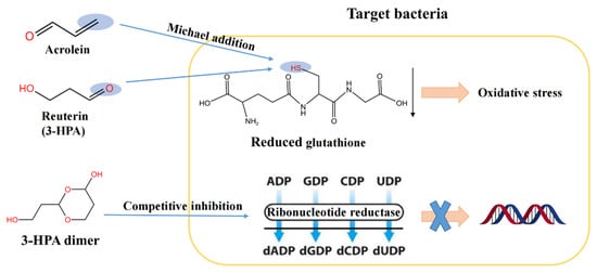 Even though the antimicrobial mechanism of the reuterin system remains unclear and controversial, the structures of some antimicrobial compounds in the system have been analyzed and their antimicrobial mechanisms are initially proposed (Figure 3). The 3-HPA dimer may exhibit antimicrobial activity through acting as a competitive inhibitor of the ribonucleotide reductase that is responsible for DNA synthesis of cells [33]. The antimicrobial activity of 3-HPA may be attributed to the aldehyde groups of 3-HPA, which can induce oxidative damages to bacteria by depletion of free sulfhydryl groups in small proteins and other molecules such as reduced glutathione and enzymes [9,40]. Furthermore, 3-HPA at concentrations of more than 10 μM can downregulate the virulence gene expression in Helicobacter pylori including vacA, flaA and luxS [41]. Notably, acrolein may deplete the free sulfhydryl groups of reduced glutathione and other enzymes through a Michael addition reaction and, thus, may induce oxidative damages to bacteria and contribute to the antimicrobial activity of the reuterin system [42]. In addition, 3-HP acts synergistically with acrolein in inhibiting microbial growth [30,43]. Overall, the application of the reuterin system as a food preservative still necessitates more insights into its antimicrobial mechanisms.