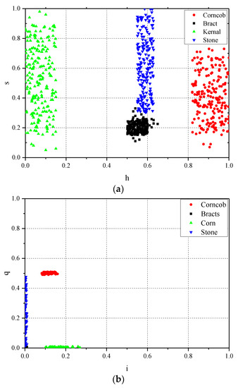According to the main components of corn impurities shown in Figure 3 and their complex colour features, this study combined the colour features and shape features in HSV, NTSC, and YCbCr colour space, which were more suitable for colour expression in machine vision, to classify and identify the impurities in corn. After manually intercepting the internal areas of some broken corncobs, broken bracts, and broken stones in the sample image, and making statistics on the pixel component parameters in the area, the statistical results of the distribution range of colour characteristic parameters of various complete impurities were obtained, as shown in Figure 5. It should be mentioned that Figure 5 shows the intensity of each pixel of the image in three colour spaces after the channel related to the illumination intensity was removed. Thus, the influence of illumination on the image was excluded. It can be seen from the figure that the values of each channel in the NTSC and YCbCr colour space overlapped partially, which was not conducive to classification and recognition. Therefore, this study set appropriate thresholds for the H and S channels in HSV colour space, and identified impurities in combination with shape features.