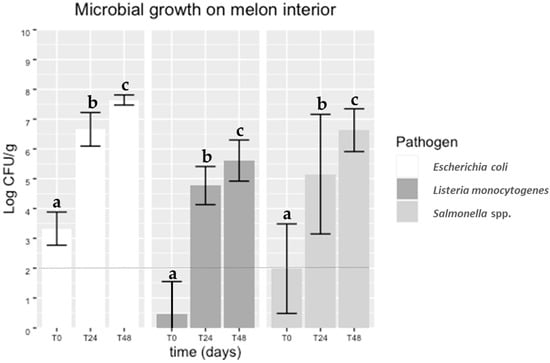 Microbial growth of Salmonella spp., Listeria monocytogenes and E. coli cocktails on the flesh of melons after 0, 24 and 48 h of cutting. The detection limit of the enumeration technique was 2 log CFU/g (dotted line). Equivalent lowercase letters mean no significant differences (p > 0.05).