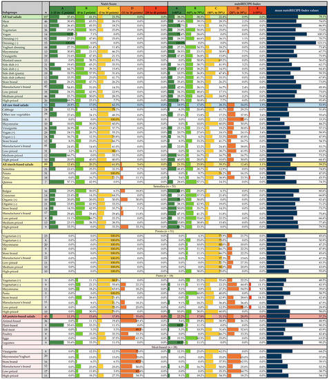 As with leaf salads, no raw food salad recorded was assigned to Nutri-Score D or E. In contrast to leaf salads, 62.3% were rated C. The remaining raw food salads were distributed almost evenly between A and B. These differences are even more revealed in the nutriRECIPE-Index (A: 18.9%, B: 17.0%, C: 28.3%, D: 34.0%, E: 1.9%; mean value: 53.3%). The contents of energy, SFA, sugar, protein, and salt were assessed by both labels and have a negative impact on the rating. Since the Nutri-Score evaluates the fruit content overall, high scores are achieved here. In the nutriRECIPE-Index, the individual nutrient amounts are evaluated so that positive values are achieved for vitamin C, vitamin B6, folate, and vitamin E, but these cannot compensate for the unfavorable rating of the other nutrients due to the weighting factors. The nutriRECIPE-Index ratings of the raw food salads indicate much higher nutritional differences among the salads than the Nutri-Score. There are differences in salads that are not rated A or B. While no salad is rated worse than C with the Nutri-Score, 35.9% of salads are rated D or E with the nutriRECIPE-Index. The nutriRECIPE-Index mean values of the subgroups range from 33.3% (milk dressing) to 73.2% (medium-priced). In medium-priced, 66.7% are in A, none in B, and 33.3% in C. Most of the salads in C are close to the B-border. Exceptions are some salads, which reach between −5 and −8 Nutri-Score-points. With the nutriRECIPE-Index, the medium-priced salads are classified into four different categories (A–D). The ratings range from 27.1% to 113.8%. Since most of the salads in A achieve excellent ratings, the nutriRECIPE-Index mean value is 73.2%, which is the best rating for a subgroup within the raw food salads.