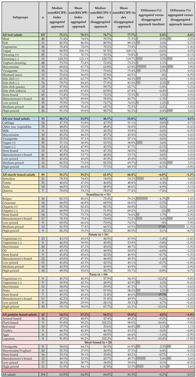 Overall, when comparing the different ingredient recording approaches, the aggregated approach leads to slightly lower nutriRECIPE-Index values than the disaggregated approach (median: −0.2%, mean: −0.5%) (Figure 4). However, the differences do not follow a uniform pattern within single salad groups, leading to varying maximal differences of −12.6% (high-priced pasta-based salads) and +17.7% (private label pasta-based salads). Within the leaf salads, the differences are minor and less than 5.8%. Within the raw food salads, the medians and means of the main group differ even less between the approaches, except for the high-priced salads (median: −6.1%, mean: −3.9%). Minor differences can be seen only when looking at the individual subgroups, although no clear trend can be identified here. Generally, starch-based and protein-based salads show higher variance than the other main groups. Here, the amount of processed ingredients is much higher than in leaf and raw food salads. In leaf and raw food salads, raw vegetables are the base, complemented by dressing and pieces of meat/eggs/cheese. While a quarter of leaf salads contain a starch-based side dish that has undergone a cooking process, no raw food salads contain a side dish. Except for a few ingredients (e.g., cheese, mayonnaise, or iodized salt), the raw food salads contain few aggregated ingredients, which is why there are minor differences between the approaches. Given that starch-based and protein-based salads are based on highly processed foods, supplemented by dressing, meat/eggs/cheese, the impact of the different approaches is larger.