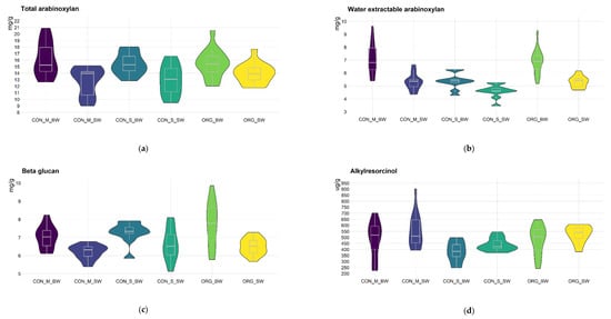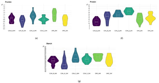 Violin plots for (a) Total arabinoxylan, (b) Water-extractable arabinoxylan, (c) β-glucan, (d) Alkylresorcinol, (e) Fructan, (f) Protein and (g) Starch content; CON—conventional farming system; M—Martonvásár, Hungary; S—conventional farming system in Serbia; ORG—organic farming system in Hungary; BW—bread wheat; SW—spelt wheat; minimum value—shown by the line below the violin plot; the first lower quartile (25th percentile)—shown by the lower end of the violin plot; median—shown by the horizontal line inside the plot; the third upper quartile (75th percentile)—shown by the upper end of the plot; maximum value—shown by the line above the violin plot.