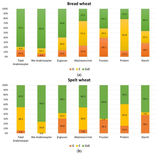 The G×E interaction determined more than 70% of the variance of total and water-extractable arabinoxylan in bread wheat (Figure 2a). A considerable effect of the G×E interaction was also found for β-glucan, fructan and starch content determining more than 40% of the total variance. A great environmental effect (farming system/country/growing season) was observed for alkylresorcinol and protein content (>50%). A large G×E interaction effect (˃45%) was found for all traits in spelt, except protein content (Figure 2b). The effect of the environment (farming system/country/growing season) was the greatest on total variance of protein content.