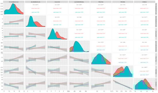 Correlations between the bioactive compound, protein and starch content for bread and spelt wheat. Above the diagonal: the Pearson’s correlation coefficients for bread (red) and spelt (blue) wheat and combined (gray); diagonal: the distributions of each trait for bread (red) and spelt (blue) wheat; below the diagonal: scatter plots with linear regression lines for bread (red) and spelt (blue) and their confidence intervals (gray areas). Correlation coefficients significant for p < 0.001 are marked with ***, those significant for p < 0.01 with ** and p < 0.05 with *. The correlation coefficients that are not marked are not significant.