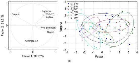 The PCA that was based on the starch-related components distinguished bread wheat from spelt wheat varieties to a large extent (Figure 4c). The first PC was defined by most of the starch-related components and accounted for 40.08% of the total variation. The second PC acounted for 21.63% of the total variation and was determined by the peak viscosity and the breakdown of the viscosity. The PCA clustered spelt wheat varieties with low gelatinization time and temperature on the left side of the biplot, opposite to conventionally and organically grown bread wheat varieties with better pasting properties clustered on the right side of the biplot.