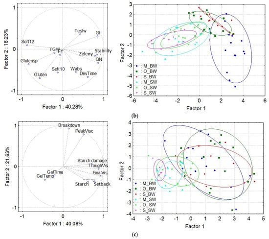 Principal component analysis of bread and spelt wheat varieties based on (a) bioactive compound, protein and starch content, (b) physical and quality traits and (c) starch-related components. M—conventional farming system in Martonvásár, Hungary, O—organic farming system in Hungary, S—conventional farming system in Serbia. BW—bread wheat, SW—spelt wheat. TOTAX—total arabinoxylan, WEAX—water-extractable arabinoxylan, Soft10, 12—dough softening after 10 and 12 min, respectively, Glutensp—gluten spread, TGW—thousand kernel weight, Testw—test weight, FY—flour yield, Wabs—water absorption of the flour, DevTime—dough development time, QN—Farinograph quality number, GI—gluten index, Stability—dough stability, Zeleny—sedimentation volume, PeakVisc—viscosity at peak, TroughVisc—remaining viscosity after breakdown, FinalVisc—viscosity after setback at the end of the temperature profile, Setback—increasing of the viscosity when cooling, Breakdown—decreasing of the viscosity at high temperature, Pasting Time—the time when gelatinization starting, Pasting Temperature—the temperature at which gelatinization is starting, Starch Damage—measured by amperometric method. Red—Serbia, Green—Organic, Blue—Martonvásár, light color—spelt, dark color—bread wheat.
