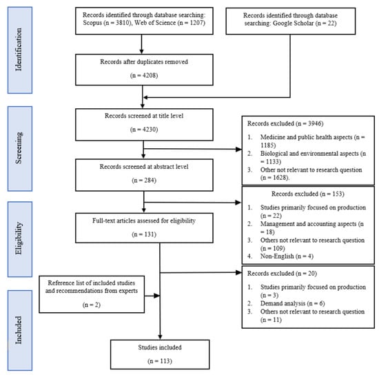 A range of electronic databases was employed to locate records published between 1 January 2010 and 31 January 2022 (83% of the publications included in the final sample were published after 2015), written in the English language and targeting three regions of Asia: East Asia, Southeast Asia, and South Asia. Search databases included the Web of Science, Scopus, and Google Scholar. An initial search was conducted in January 2022 that included all records with a title or abstract containing the following search string: (aquatic OR seafood OR fish OR shellfish) AND (consum* OR eat* OR intake) AND (behav* OR intention OR choice* OR attribute OR preference OR attitud* OR habit OR buy* OR purchas* OR willing* OR perception) AND (Asia OR “South Asia” OR “Southeast Asia” OR “Northeast Asia” OR “East Asia” OR China OR Japan OR “South Korea” OR “North Korea” OR Taiwan OR “Hong Kong” OR Mongolia OR Macao OR Brunei OR Burma OR Myanmar OR Cambodia OR Timor-Leste OR Indonesia OR Laos OR Malaysia OR Philippines OR Singapore OR Thailand OR Vietnam OR India OR Bangladesh OR Nepal OR Maldives OR “Sri Lanka” OR Bhutan OR Pakistan OR Afghanistan). The search string was adapted to the syntax of each database.