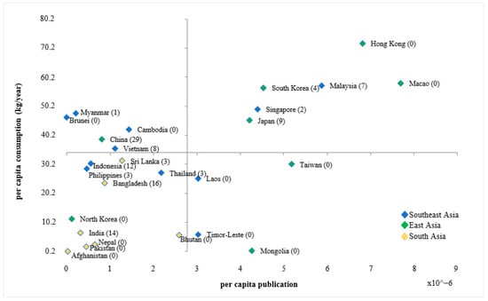 Variations in per capita publication ×10−6 versus per capita aquatic food consumption (kg/capita/year). Data on per capita aquatic food consumption was taken from []; per capita publication was based on the potential publications to aquatic food consumption behaviour identified through the Scopus database; the bracket indicates the number of publications selected in the scoping review; the Maldives being an outlier was excluded.