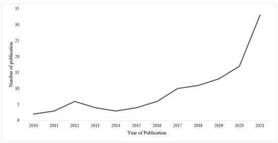 After the initial search, 4232 potential records were identified from the three databases. Following the eligibility criteria, the title and abstract of each article were screened and evaluated to either include or exclude the article. At the title level, 3946 articles, and, at the abstract level, 153 articles were excluded that were clearly irrelevant. This process was further repeated by one independent reviewer, and disagreements were resolved through consensus. Full texts of 131 articles were further evaluated to finally include 111 articles. Two additional articles relevant for the scoping review but not identified through this process were recommended by experts. The overall selection process of the 113 identified articles is shown in Figure 1 and is summarized in Table S3, which contains brief information on each publication, including research focus and design. The results from Figure 2 indicate that variation exists in per capita research intensity versus per capita aquatic food consumption (kg/year). Countries such as Hong Kong and Macao have a high per capita aquatic food consumption as well as a high research intensity per capita; however, none were relevant for this scoping review. Further, although China has a comparatively low research intensity per capita, 29 publications were relevant for this study. The results from Figure 3 indicate that 31 publications were recorded in the year 2021 compared to 2 in the year 2010, and publications have more than doubled after 2019.
