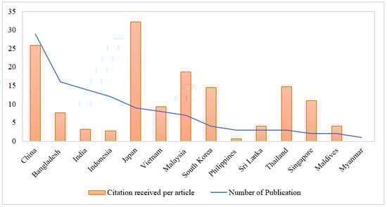 Further, the distribution of the identified 113 publications stratified by countries and the number of citations received per article (CRPA) in each country was obtained (Figure 4). The results indicated that Japan, with a lower volume of publications, is responsible for many cited articles.