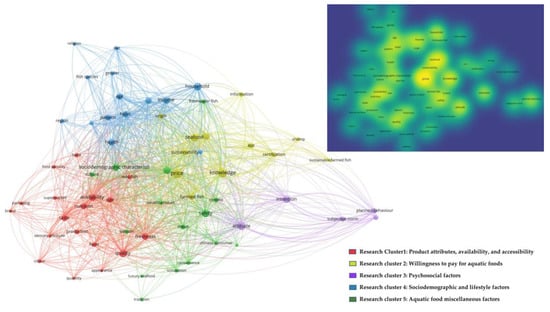 Research cluster 1: Aquatic food product attributes, availability, and accessibility—23.9% of the identified publications (n = 27). There was a clear, consistent finding indicating that product attributes, both intrinsic aquatic food product attributes (e.g., taste, flavour, texture, colour, form, and appearance) and external aquatic food product attributes (e.g., quality, packaging, and brand), determine Asian consumers’ aquatic food consumption behaviour. The findings also indicate that taste is dominant over attributes such as health and nutritional value of aquatic foods among the majority of consumers in Asia. Further, availability and accessibility also contribute to aquatic food consumption behaviour [,,,,]. For instance, after price, availability and accessibility were ranked the second and third most important factors influencing fish purchasing behaviour among Indian consumers [].