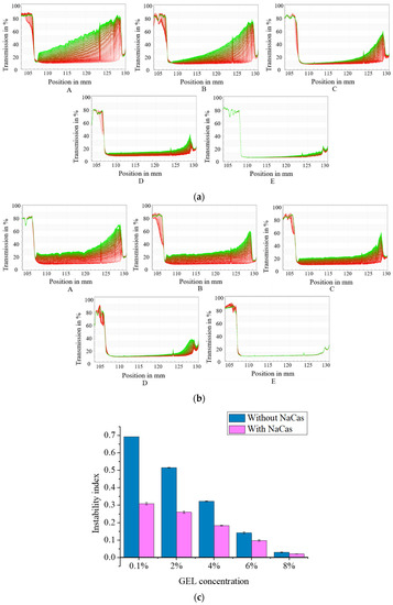 LUMiSizer analysis of CaCO3 S/O/W emulsions prepared by different GEL concentrations (0.1, 2, 4, 6, 8 wt%): (a) without NaCas; (b) with NaCas; (c) instability index. The red and green sections are all the transmittance curves.