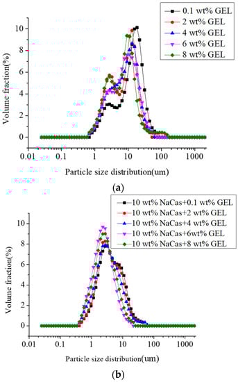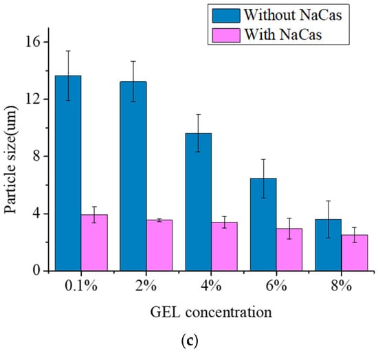 Particle size analysis of CaCO3 S/O/W emulsions prepared by different GEL concentrations (0.1, 2, 4, 6, 8 wt%). Particle size distribution—(a) without NaCas; (b) with NaCas; (c) mean particle size.