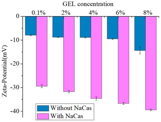 The zeta-potential is an electrostatic repulsion to characterize the stability of the S/O/W-emulsion droplets. In general, the higher the absolute value (positive or negative) of the zeta-potential, the more stable the system (dissolution or dispersion can resist aggregation). On the contrary, the lower the zeta-potential (positive or negative), the more unstable the system is and the more inclined to condensation (the attractive force exceeds the repulsive force), and the dispersion is destroyed. The effects of the different GEL concentrations on the zeta-potential of the S/O/W-emulsion microspheres is shown in Figure 3. The zeta-potential of the samples stabilized by different concentrations of the GEL were all negative. The pH of the S/O/W-emulsion liquid system was 7.0, and the pI of the GEL was 7.5~9. At a low GEL concentration (0.1 wt%), the zeta-potential value was only −7.92 ± 0.21 mV. With the GEL concentration increased, zeta-potential became −14.33 ± 1.44 mV (8 wt%), and the stability of the system was enhanced. When NaCas was added to the W phase (pI was 4.6), the zeta-potential increased, and the stability was improved.