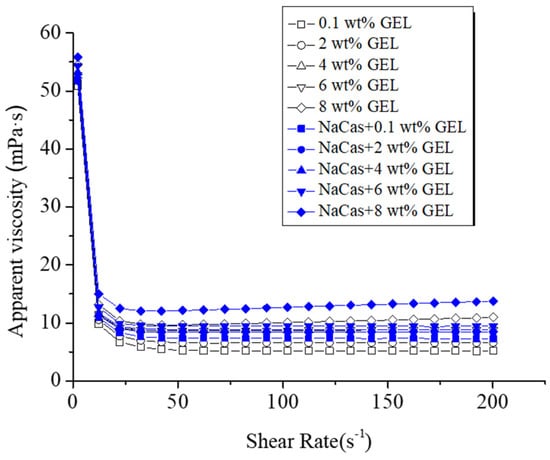 Apparent viscosity is closely related to the stability of the emulsion system. The rheological property of emulsion is closely related to its internal system and reflects its microstructure. The effects of different GEL concentrations on the apparent viscosity of the droplets are shown in Figure 4. The apparent viscosity decreased with increasing shear rate and then gradually became stable, indicating that the system has pseudoplastic fluid properties. The network structure was damaged when the shear rate increased, which led to the orderly arrangement according to the flow direction, reducing the flow resistivity and the apparent viscosity []. The apparent viscosity increased as the GEL concentration increased, and the GEL molecules played a thickening role and constituted to the network structure, which led to the increase of system stability. When NaCas was added to the W phase, the GEL permeated into the NaCas network structure, resulting in the increased structural strength of the spatial network and the improved the S/O/W emulsion stability.