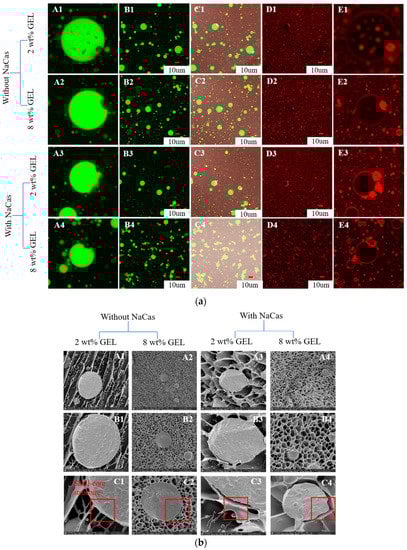 The CLSM images characterized the formation of the samples (Figure 5a). The O phase displayed green, the W phase displayed red, and the black part of the inner oil phase was CaCO3. Without NaCas, the droplets prepared by GEL (2 wt%) had a wide size range, low zeta-potential, and the system was unstable. When the GEL concentration increased (8 wt%), the particle size distribution was more uniform and the particles were smaller, which were consistent with the results in Figure 2. When NaCas was present in the W phase, the size of the droplets prepared by the GEL (2 wt%) decreased, the interaction between GEL and NaCas was lessened, the system was relatively unstable, and the encapsulation effect of the CaCO3 was poor. At a high GEL concentration (8 wt%), the GEL and NaCas interaction increased, the particle size distribution was more uniform and the particles were smaller, the stability was improved, and the encapsulation effect of the CaCO3 was enhanced. Magnifying the results of the external aqueous protein staining showed that the presence of NaCas enhanced the thickness of the adsorption layer, which was advantageous to the formation of microspheres and the stability of the system.