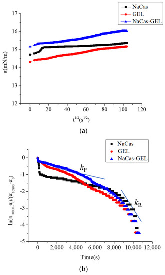 Protein has a direct impact on emulsification performance and therefore plays an important role in oil–water emulsions []. The primary adsorption of proteins at the interface is the most significant stage in emulsion formation []. In order to better understand whether the formation of the NaCas–GEL mixture in aqueous solution leads to the difference in adsorption behavior of interfacial protein components, the dynamic adsorption performance of NaCas, GEL, and NaCas–GEL was studied, and the π-t1/2 relation curve is shown in Figure 6a. The π value gradually increased with the extension of the adsorption time, indicating that the complex formed by NaCas, GEL, and NaCas–GEL gradually adsorbed onto the oil–water interface [,]. The result showed that the presence of GEL had a significant influence on the interfacial pressure generated by NaCas adsorption at the oil–water interface. Compared with NaCas, the interfacial pressure of the NaCas–GEL mixture was higher.