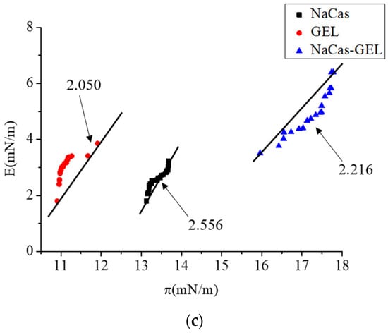 Figure 6c showed the evolution of E with π in the surface layer for the adsorption of NaCas and NaCas–XG mixed films. The E−π curve and its slope can give information about the adsorption capacity of particles on the interface and the interaction between molecules []. The slope of the E−π curve is about 1, indicating that the protein is ideally adsorbed on the interface at this time. The increase of E is only related to the amount of protein adsorbed on the interface, and there is no obvious interaction between protein particles. A slope value for the E−π curve greater than 1 indicates that the adsorption of components on the interface is nonideal and there is strong intermolecular interaction. The slope value of the E−π curve is less than 1, which indicates that the adsorption of components on the interface is nonideal and there is weak intermolecular interaction. Results showed that the E increased with the interfacial pressure, and this dependence reflects the existence and the increase of interactions between film-forming components. The longer the adsorption time, the higher the E, which was in agreement with the theory of Lucassen–Reynders. The slope values for the E−π curves reported in Figure 6c are all higher than 1.0, which indicates a strong interaction between the interfacial membrane components compared to the ideal adsorption behavior. The slopes of the E−π curves of the NaCas–GEL mixtures were all higher than those of GEL, indicating that the presence of NaCas had a significant effect on the molecular structure and/or condensation (stacking) of NaCas adsorbed at the oil–water interface. NaCas increased the E value of the GEL interfacial absorption layer, which indicated that the interaction between the NaCas and GEL can improve the mechanical strength of the oil–water interfacial absorption layer, which has good interfacial stability for stabilizing the S/O/W emulsion.