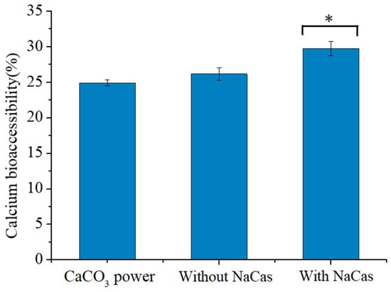 The bioaccessibility of CaCO3 was measured using an inductively coupled plasma optical emission spectrometer (ICP-OES) (Optima 8000, PerkinElmer, Waltham, MA, USA) after in vitro digestion. The enzymes in the intestine digestion products were inactivated in a 100 °C water bath for 15 min and then centrifuged at 10,000 rpm for 40 min to collect the micelle phase. Secondly, a calibration blank was made with ultrapure water, followed by a standard linear value with a standard calcium solution having a series of concentration gradients (R2 > 0.999). The micelle phase was diluted 100 times with ultrapure water and calcium concentration was measured at a wavelength of 422.67 nm. The following equation was used to calculate calcium bioaccessibility []: