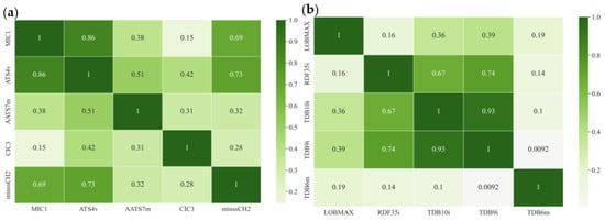 Based on Pearson’s correlation coefficients, autocorrelation analysis of the two descriptors used to train the MLR-QSAR model was conducted. Figure 3a,b show the optimal autocorrelation plots of the descriptors for the 2D-MLR- and 3D-MLR-QSAR models of the flavonoids, respectively. The results showed that the pairwise correlation of most of the key descriptors was less than 0.8, indicating that the correlation between these key descriptors was not strong. It follows that the constructed model can be used to quantify the inhibitory activity of dietary flavonoids on α-glucosidase. Since the 2D-MLR-QSAR model had better predictive performance, it was used for prediction and screening in subsequent study.