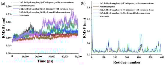 The dynamic stability and binding energy of the complexes were further analyzed by molecular dynamics (MD) simulations. RMSD was used to determine the average deviation of the complex conformation from the original conformation at a given time and to assess whether the complex system had reached a steady state [55]. As shown in Figure 5a, both 2-(3,5-dihydroxyphenyl)-5,7-dihydroxy-4H-chromen-4-one and 2-(2,5-dihydroxyphenyl)-5,7-dihydroxy-4H-chromen-4-one systems reached equilibrium at 20,000 ps, and their RMSD values remained stable at 0.12 and 0.14 nm, respectively. Both 2-(3,4-dihydroxyphenyl)-5-hydroxy-4H-chromen-4-one and morelosin showed a rise in their RMSD values in the first 25,000 ps of the simulation and then became more stable at 45,000 ps while reaching equilibrium, and their RMSD values remained stable at 0.20 and 0.18 nm, respectively. The norartocarpetin system reached equilibrium faster, within 15,000 ps, and was stable at an average value of 0.10 nm. Moreover, norartocarpetin was the least fluctuating system overall among the five systems. In summary, the five systems converged and balanced within 50,000 ps of simulation, with 2-(3,5-dihydroxyphenyl)-5,7-dihydroxy-4H-chromen-4-one, 2-(2,5-dihydroxyphenyl)-5,7-dihydroxy-4H-chromen-4-one, and norartocarpetin showing the best stability.