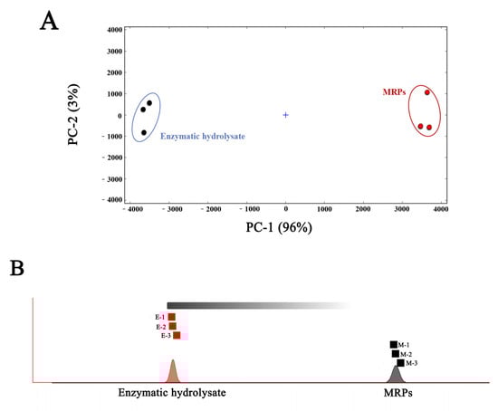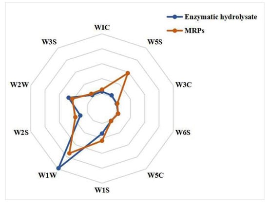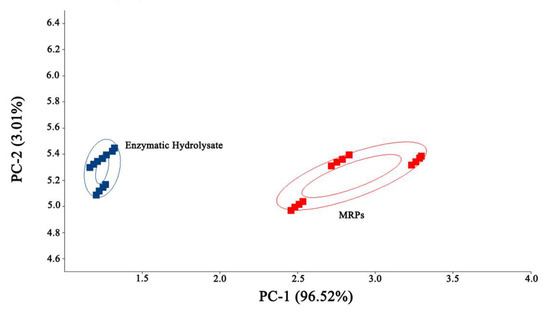 Principal component analysis (PCA) is a commonly used chemometric method to reveal the relationship between variables through data dimensionality reduction [18]. As shown in Figure 3, the contribution rate of the first principal component (PC-1) was 96.52%. The second principal component (PC-2) was 3.01, and the first principal component played a major role in the sample. The enzyme hydrolysate samples are mainly distributed between 1.0 and 1.5, while the MRPs are mainly distributed between 2.5 and 3.5. The two samples can be well distinguished, indicating the flavor difference between the two.