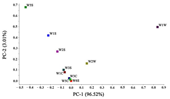 The sensor differential contribution rate analysis (Loading analysis, LA) is a measure of the magnitude of the sensor contribution in the process of discrimination. It can confirm the contribution rate of each sensor to the sample differentiation, thus determining the aroma components that play the main role in the sample differentiation process. The results of the Loading analysis are shown in Figure 2. From Figure 2, the contribution rate of the first principal component (PC-1) was 96.52%, the second principal component (PC-2) was 3.01, and the total contribution was 99.53%. It showed that the first and second principal components could characterize most of the characteristic aromas in the samples. W1W showed the highest contribution rate on PC-1 and W5S on PC-2, indicating that sulfide was correlated highly with the PC-1, and nitrogen oxides correlated most strongly with the PC-2.
