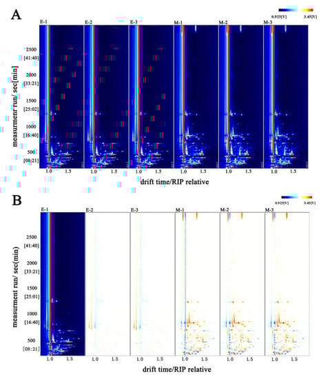 GC-IMS spectrum of enzymatic hydrolysate and its MRPs. (A): GC-IMS top view of the sample spectrum; (B): GC-IMS difference spectra of samples. “E” denotes the enzymatic hydrolysate; “M” denotes the MRPs.