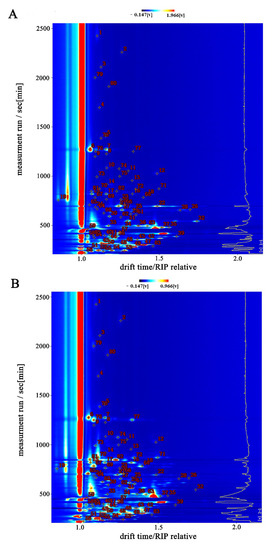 To directly compare the differences in volatile compounds in the samples, we created a two-dimensional top view and a difference spectrum (Figure 4). Figure 4A,B represent the top view and difference spectra of the two samples, respectively. The vertical coordinate represents the retention time (s) of the GC, the horizontal coordinate represents the ion migration time (normalized), the red vertical line at the horizontal coordinate 1.0 is the RIP peak (reactive ion peak, normalized), and each point on either side of the RIP peak represents a volatile compound [18]. As can be seen in Figure 1, the two samples have similar types of volatile compounds, but the signal intensity differs significantly.