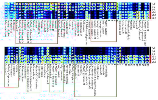 Gallery plot of the enzymatic hydrolysate and its MRPs. “E” denotes the enzymatic hydrolysatet; “M” denotes the MRPs. The numbers represent unidentified compounds. M and D after the compound indicate the monomer and dimer of the compound. The red box indicates that the concentration of the compound decreases after the MR, and the green box indicates that the concentration of the compound increases after the MR.