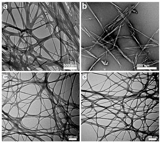 TEM images of (a) natural BC. Reprinted with permission from [16]. Copyright (2018), Elsevier. (b) BCNCs from BC by hydrochloric acid hydrolysis. Reprinted with permission from [17]. Copyright (2011), American Chemistry Society. (c) BCNFs from BC treated by high-pressure homogenization and (d) TOBC from BC treated by TEMPO-mediated oxidation. Reprinted with permission from [18]. Copyright (2019), Elsevier.