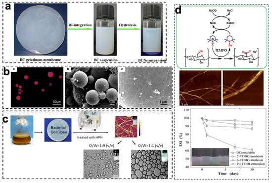 Compared with BCNCs, BCNFs are green and environmental nanoparticles used as Pickering stabilizers, which are usually obtained by subjecting BC suspensions via mechanical approaches without too much acid waste and pollution. BCNFs are long and flexible nanofibers, containing both crystalline and amorphous regions, which are organized with fibrillar elements of 10–50 nm widths and several micrometer lengths (Figure 2c). Similar to CNF preparation methods, BCNFs can be prepared by traditional mechanical treatments, such as homogenization, microfluidization, grinding, and aqueous counter collision, combined with enzymatic degradation, mild acid hydrolysis, or 2,2,6,6-tetramethylpiperidine-1-oxyl (TEMPO) oxidation to reduce energy consumption and improve particle dispersibility [16,36,37]. Different kinds of BCNF-based particles with various preparation methods have been successfully applied for Pickering emulsion stabilization, which are summarized in Table 1.