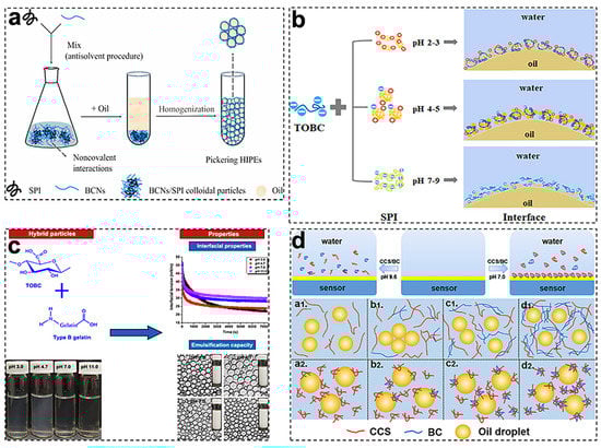 Studies on O/W Pickering emulsions stabilized by BCNF-based complex particles: (a) Schematic mechanism for the formation of Pickering high-internal-phase emulsions (HIPEs) stabilized by BCN/SPI composite colloidal particles. Reprinted with permission from [41]. Copyright (2021), Elsevier. (b) Schematic illustration of the interfacial adsorption behaviors of SPI/TOBC complexes at different pH values (2–9). Reprinted with permission from [56]. Copyright (2021), Elsevier. (c) Appearance and interfacial properties of TOBC–gelatin (GLT) mixtures, and morphology of TOBC/GLT-mixture-stabilized emulsions. Reprinted with permission from [44]. Copyright (2022), Elsevier. (d) Schematic illustration of the interfacial adsorption behaviors of BC/carboxymethyl chitosan (CCS) dispersions at the O/W interface investigated by QCM-D, and stabilization mechanism of BC/CCS-based emulsions: a, CCS only; b, CCS with a few BCs; c, CCS with many BCs; and d, CCS with very many BCs. The pH values were controlled between 9.6 (a1–d1) and 7.0 (a2–d2). Reprinted with permission from [46]. Copyright (2022), Elsevier.