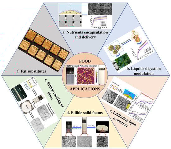 Overview of the applications of O/W Pickering emulsions stabilized by BCNF-based particles: (a) Nutrient encapsulation and delivery. Reprinted with permission from [57]. Copyright (2022), Elsevier. (b) Lipid digestion modulation. Reprinted with permission from [42]. Copyright (2022), Elsevier. (c) Inhibiting lipid oxidation. Reprinted with permission from [18]. Copyright (2019), Elsevier. (d) Edible solid foams. Reprinted with permission from [43]. Copyright (2020), Elsevier. (e) Edible coatings or films. Reprinted with permission from [58]. Copyright (2020), American Chemistry Society. (f) Fat substitutes. Reprinted with permission from [59]. Copyright (2021), Elsevier.