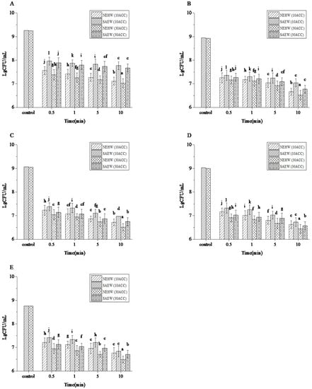 Under the conditions, both disinfectants could reduce the strain concentration by at least 1.5 lg cfu/mL. NEHW achieved the 99% killing rate after 15 min of sterilization at 10 ACC, while SAEW achieved the same effect after 5 min of sterilization at 30 ACC or 10 min of sterilization at 10 ACC. For the same strain, the difference in the bactericidal effect of NEHW at 30 and 10 ACC was greater than that of SAEW. The sterilization effect of NEHW was significantly higher than that of SAEW, which was not above the limitation < 3. Studies have focused on the bactericidal activity of SAEW against various bacteria, including B. cereus, Vibrio vulnificus, and V. parahaemolyticus, Salmonella enteritidis, and Aspergillus flavus [17,32,34,35]. Our results are in agreement with those of the previous report. For the previous similar studies, NEHW and plasma-activated water both showed good germicidal efficacy. At the same time, plasma-activated water has also proven that it can be used to inactivate biofilm-forming pathogens from stainless steel surfaces [10].