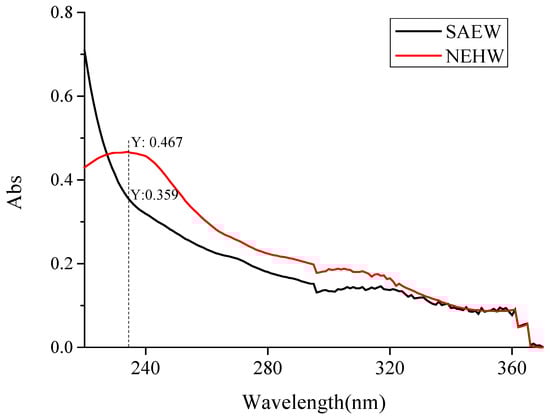 The results of NEHW and SAEW scanning at the wavelength of 220 nm—370 nm on the UV-Vis spectrophotometer. The physical and chemical parameters of NEHW and SAEW are both pH: 5.7; ACC: 30.