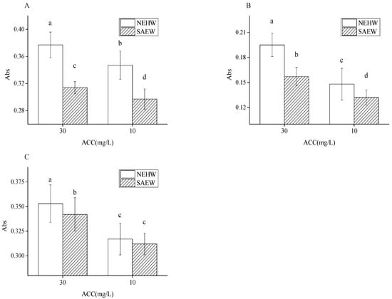 The detection of hydroxyl radical content by NEHW and SAEW under 30 and 10 ACC. (A) is the crystal violet detection method, (B) is the salicylic acid detection method, (C) is the methylene blue detection method. The different letters indicate significant differences (p < 0.05).