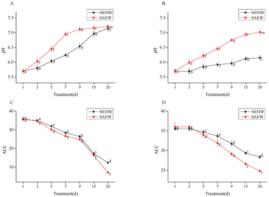 Under the condition of sealed and avoiding light, on the 7th day of treatment, the pH of SAEW increased from 5.7 to 6.46 (12.3% changed), and ACC decreased from 36 to 31.9 (11.3% changed) (Figure 4, p < 0.05), while the pH of NEHW increased from 5.7 to 5.92 (3.8% changed), and ACC decreased from 35.5 to 33.68 (5.1% changed) (Figure 4, p < 0.05). On the 20th day of treatment, the pH value of SAEW increased from 5.7 to 7.02 (23.1% changed), and ACC decreased from 36 to 24.80 (31.1% changed) (Figure 4, p < 0.05), while the pH value of NEHW increased from 5.7 to 6.15 (7.9% changed), and ACC decreased from 35.5 to 28.36 (20.1% changed) (Figure 4, p < 0.05).