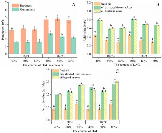 The texture (A) of crackers made with 40, 60 and 80% olive-based DAG oil; the AV (B) and POV (C) of oil at 160 and 180 °C. Different lowercase letters denote that values were significantly different (p < 0.05), and there was no significant difference (p > 0.05) between oil extracted from crackers and oil heated in oven. * Indicates significant difference (p < 0.05) between fresh oil and oil extracted from crackers or oil heated in the oven.