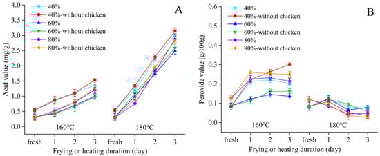 As expected, the AV increased proportionally as temperature increased, until it reached 3.30 mg/g (Figure 2A). With the extension of frying duration, the POV increased slowly and then decreased. Interestingly, the POV reached its peak value (0.23 g/100 g) on the first day and then decreased to 0.19 g/100 g (Figure 2B). In addition, there was no significant difference (p > 0.05) between frying chicken and control (without chicken).